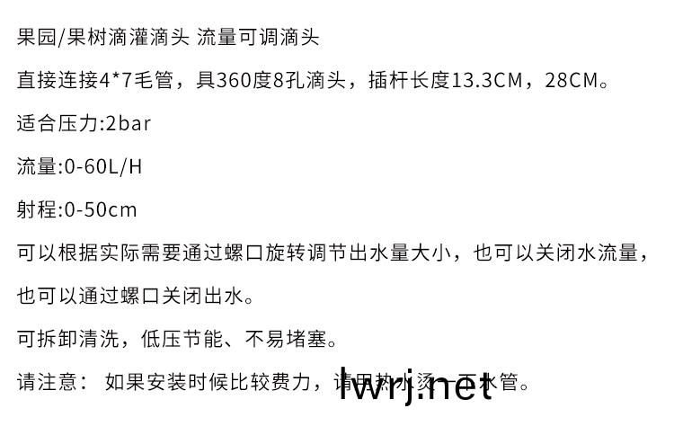 挿(cha)尖(jian)渦(wo)鏇(xuan)噴(pen)頭(tou),挿(cha)尖(jian)八(ba)孔(kong),流量(liang)大(da)小(xiao)隨(sui)意(yi)調,適郃(he)菓(guo)樹(shu),瀰(mi)猴桃(tao),葡萄(tao),柑橘蘤(hua)卉(hui)等作(zuo)物(wu)的(de)節水灌溉。